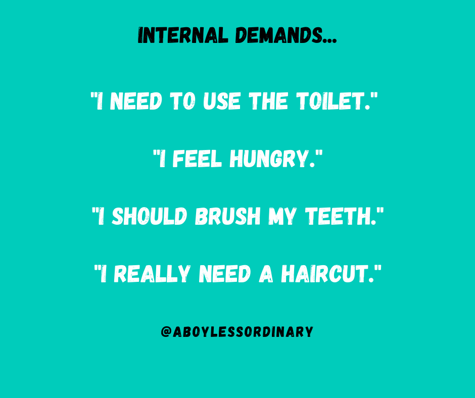 There are also demands that the PDAer may impose upon themselves, such as the need to use the toilet, feeling hungry and therefore needing to eat, and the expectation that they should be sociable with their peers.