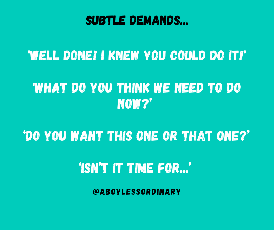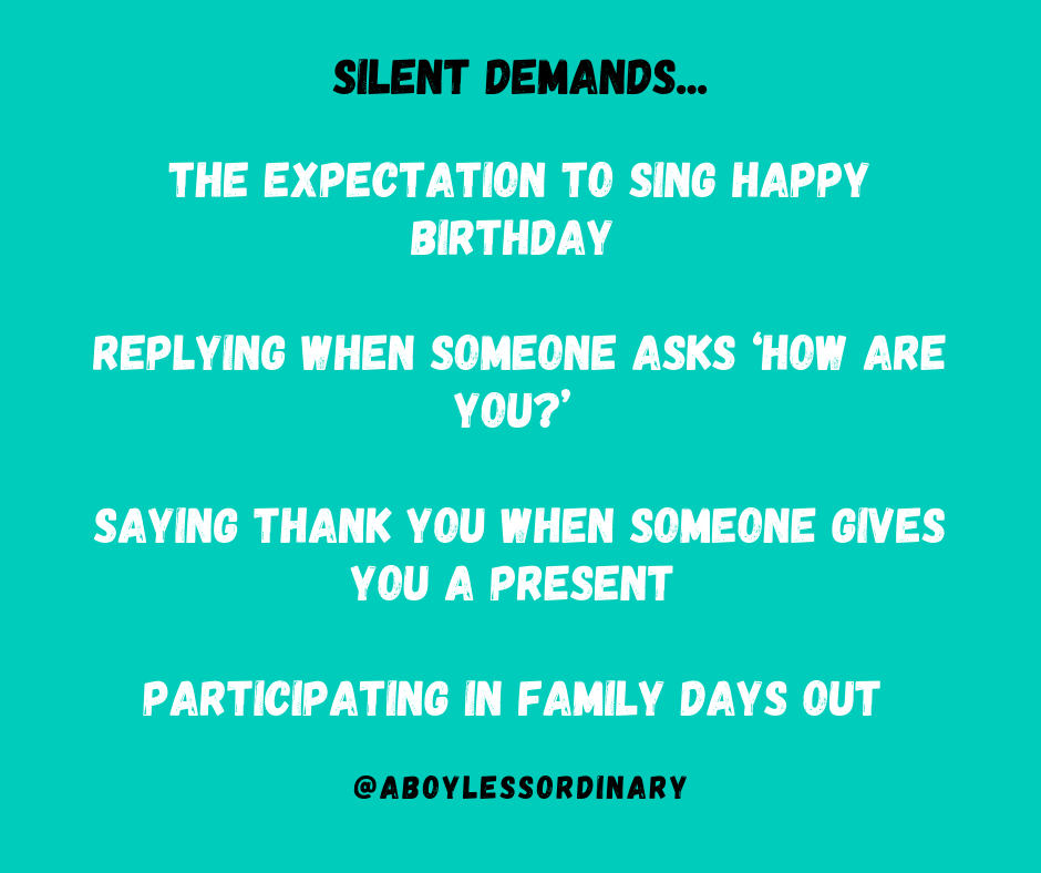 These hidden demands are everywhere, many of which are routed in traditional ‘good manners’. For example, the expectation to say please and thank you, replying when someone asks you a question, and having to make a choice – all of which can cause huge anxiety.